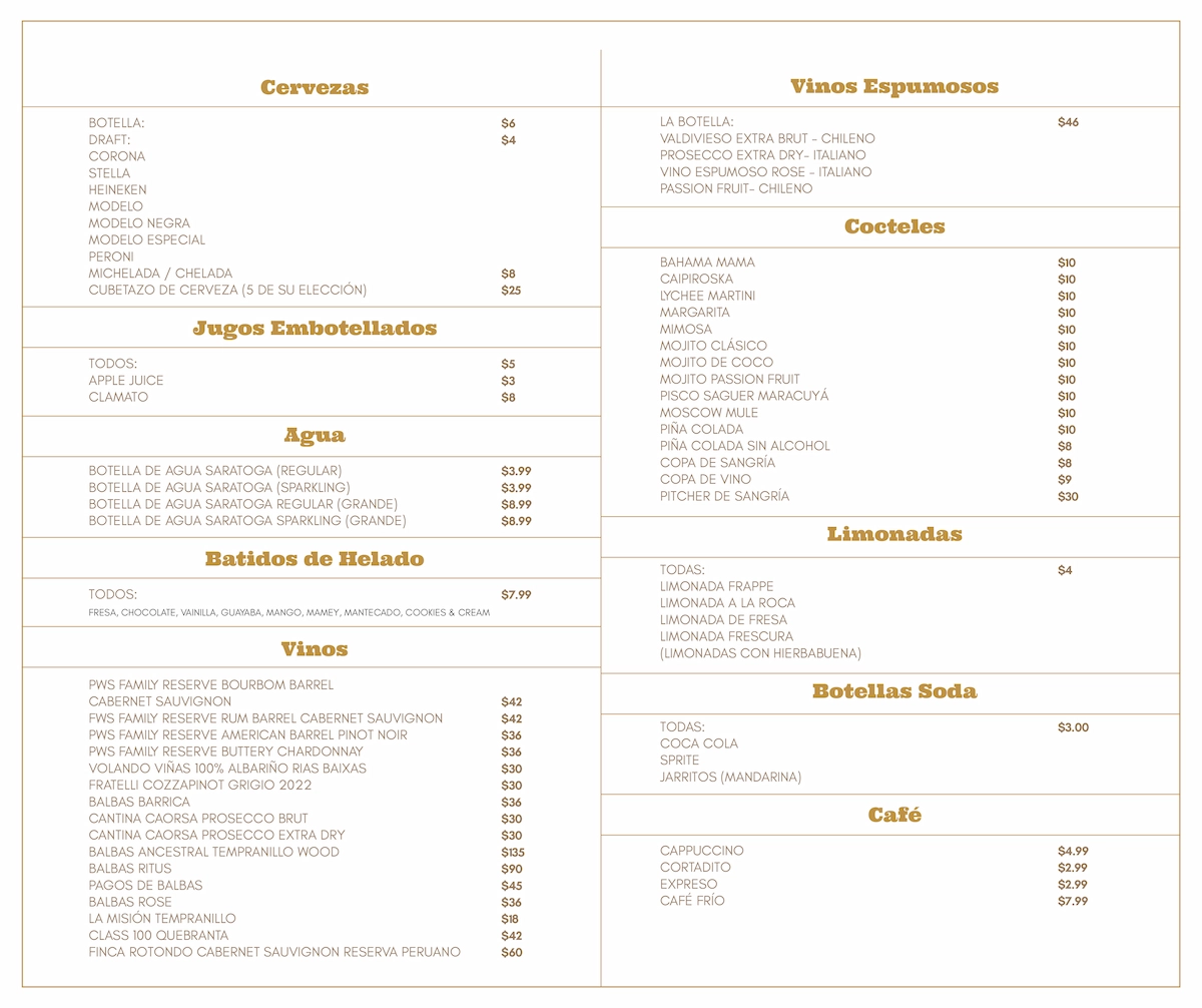 Tenemos una selección de vinos y cócteles cuidadosamente seleccionados que complementan nuestros platos de carne. Nuestro personal puede brindarle recomendaciones.